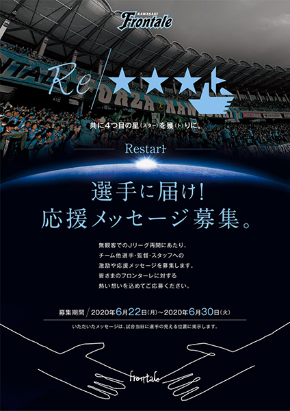 無観客でのJリーグ再開にあたり、チームや選手、監督、スタッフへの激励や応援のメッセージなど、皆さまのフロンターレに対する熱い想いを込めてご応募ください。
