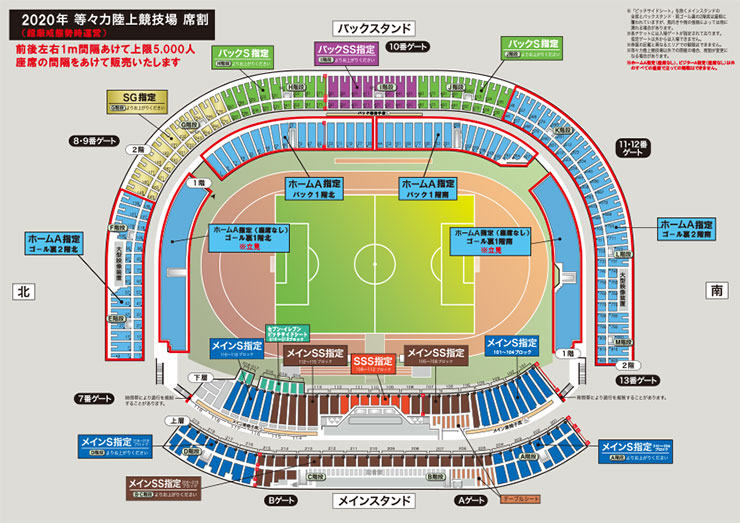 1階サイドスタンド(北側、南側)の立見席も含め、全席指定席での運用をいたします。