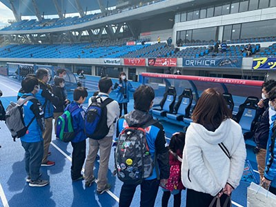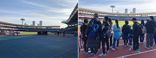 試合当日に陸上トラックを一周し、メインスタンド前で記念写真が撮れるツアーです。
