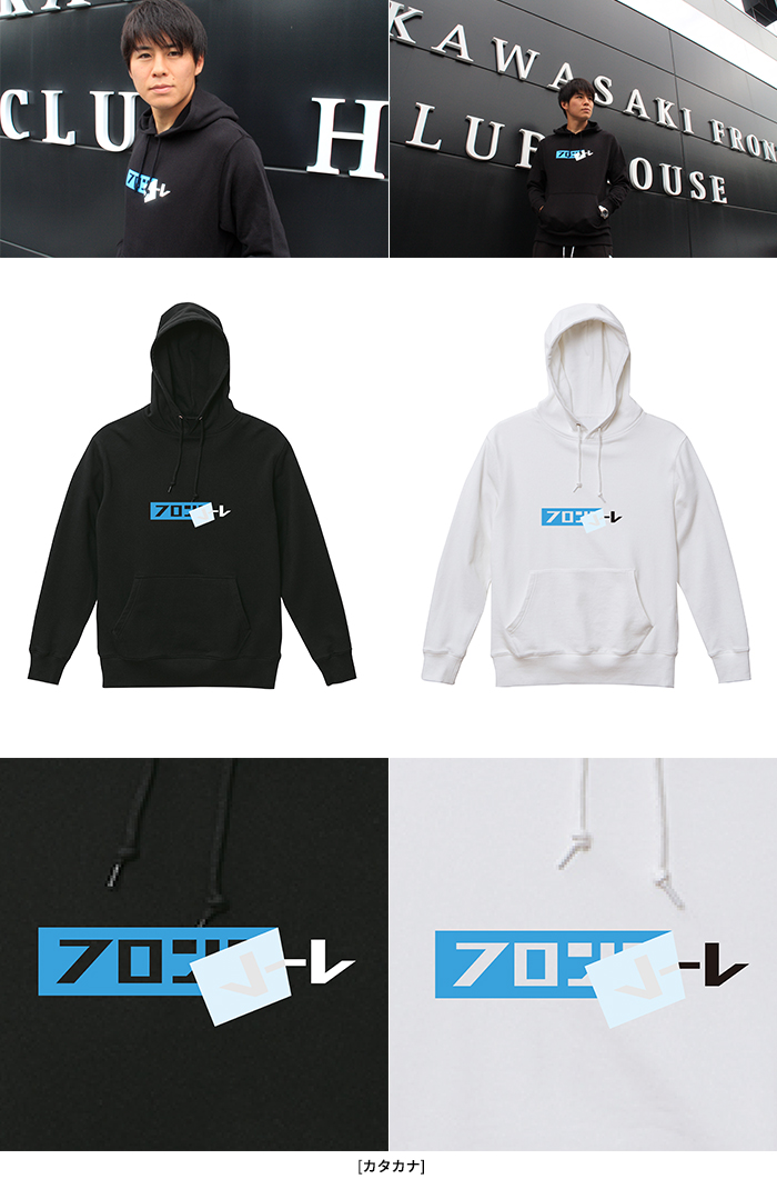 ちょっとお茶目なデザインが光るフロンターレブルーのプリントを使用した‟カタカナ”デザインと、よ~く見るとFRONTALEの文字が2つ隠れている‟FRONTALE”デザイン。どなたでも合わせやすいブラックとホワイトボディを採用。最後に…。ヤストがカッコよすぎてモデルみたい…。