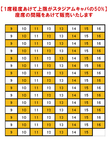 ◆Jリーグの方針に従った川崎フロンターレの座席配席について(この試合は【ステップ3】となります)周囲との間隔を「1席以上」間隔をあけたうえで、席数の上限は「スタジアム収容率の50%」での運用となり、全ての座席が市松模様(前後左右1席程度空き)での配席とし席数の上限は「約12,000席程度」での運用となります。 |