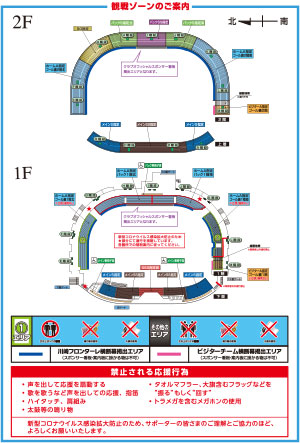 ※ビジターチームのユニフォーム・グッズや、その他対戦相手を連想させるものを着用しての入場・観戦は13番ゲート並びにビジター指定席のみ可能となりますのでご注意ください。(メイン車椅子席は除く)