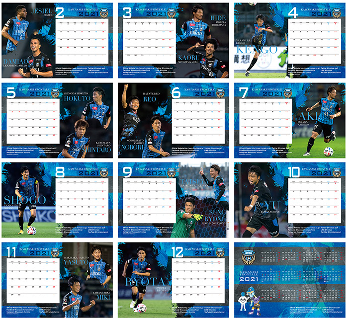 ピッチ上の選手たちの表情を中心に2020シーズン在籍(9月末時点)の全選手を掲載した壁掛けタイプのカレンダーになっています。