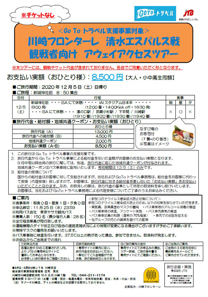 (株)JTB川崎支店では、「12月5日(土)vs清水エスパルス」の川崎フロンターレ・アウェイツアーの参加者を募集いたします。いよいよ今シーズンも終盤に差し掛かりました!皆様のお申込みをお待ちしております!