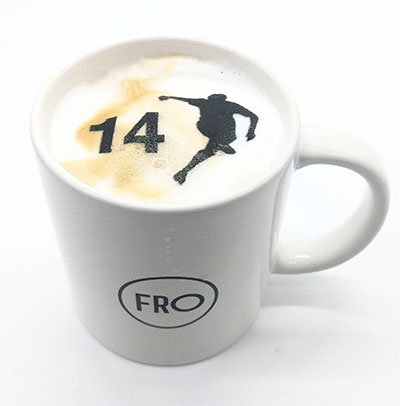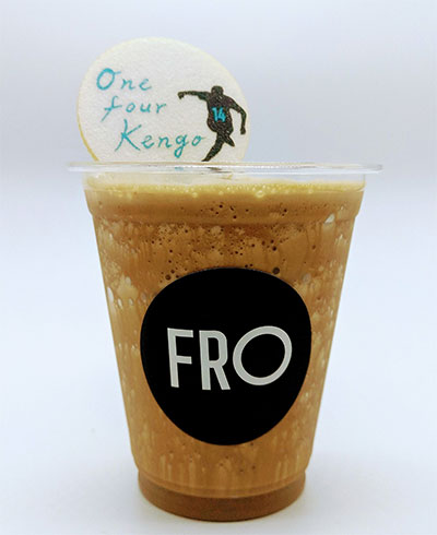 価格:500円(税別) ケンゴを象徴するシルエットをココアパウダーを使い表現したふんわり甘く、ほろ苦い後味が特徴のカフェモカです! |