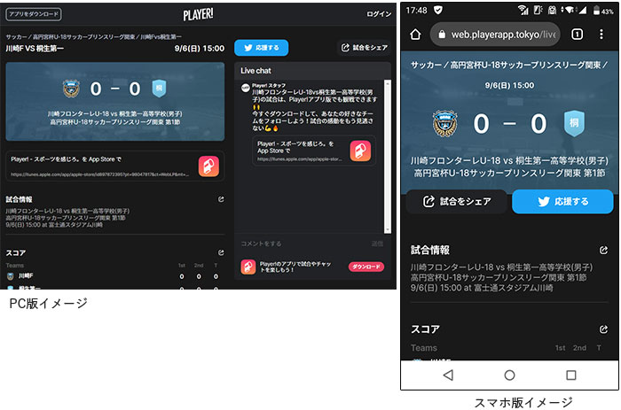 「無観客試合」での開催となりますが、フロンターレアカデミーの選手たちの戦いぶりをタイムリーに皆さんにお届けするため、スポーツライブエンターテイメントアプリ「Player!」にて試合速報を実施します。コメントを書き込むこともできますので、皆さんぜひご覧ください。
