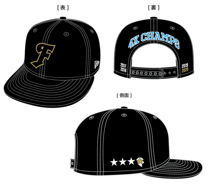 フロントデザインのFロゴは金糸を使い表現、サイドとバックデザインで4つ目の星(優勝)獲得をデザインしました!スナップバック仕様(サイズ調整可能)のため、どなたにもオススメのキャップです。