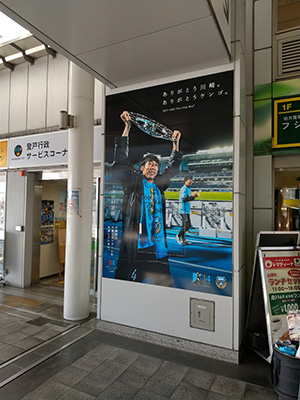 改札前の壁面に、先日の明治安田生命J1リーグ優勝決定直後にシャーレ掲げた中村憲剛選手の写真を掲出します。(1月下旬まで)
