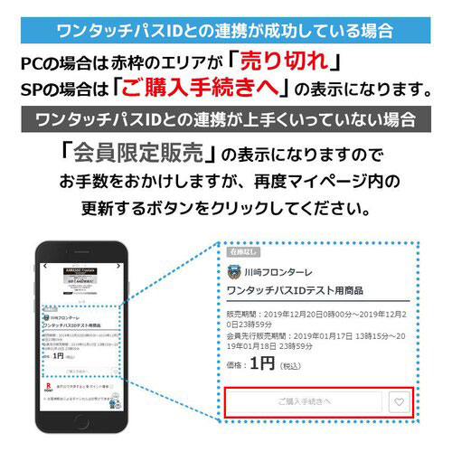 JリーグIDとワンタッチパスID(2021シーズン後援会会員番号)の紐づけ設定を行った後、下記の手順で購入方法を事前にお試しいただくことができます。