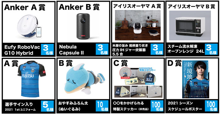 川崎フロンターレを応援してくださる皆様には、スタジアムチェックイン・リモートチェックインをいただいた方の中から抽選で、227名様に豪華景品をプレゼントいたします。