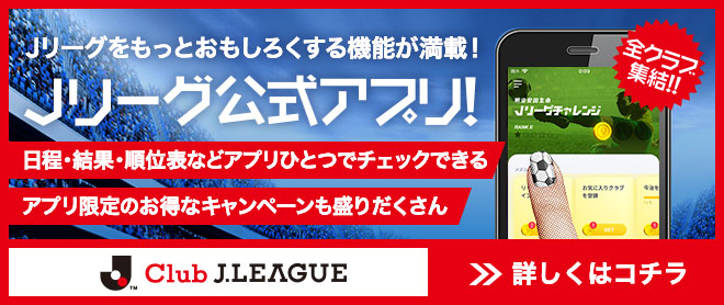 | Jリーグ公式アプリ「Club J.LEAGUE」はこちら | チケット購入から試合情報、ニュース、メダル特典、リモートチェックインなどJリーグをもっとおもしろくする機能が満載のアプリ! >> https://www.jleague.jp/app/ |
