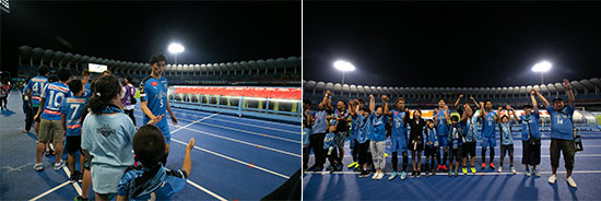 川崎フロンターレが勝利時、試合直後にピッチ横トラック上にて、選手の活躍を称える拍手と、共に万歳三唱をします。