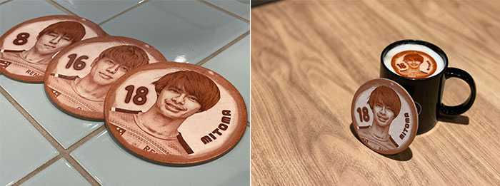 選手写真をラテアートにして提供出来たらいいな…。という話合いの中からピーーン!!と生まれたグッズ。