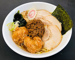 チャーシュー、肉みそ、唐揚げを全部乗せ!! |