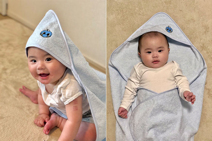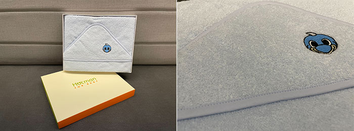 新たなフロンターレサポーターを優しくふろん太デザインのおくるみが包んでくれます。ご自宅用はもちろん、プレゼントとしても人気のグッズ。