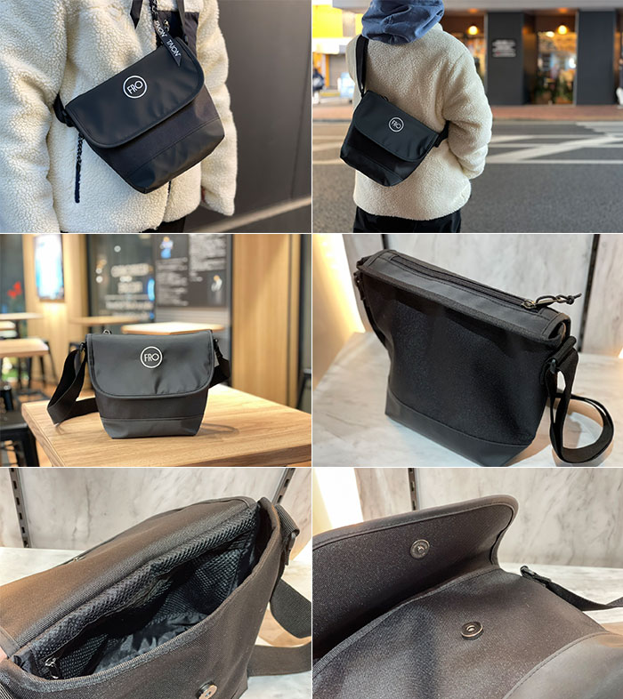 男女問わず合わせやすいようにブラックボディにワンポイントとして刺繍でFROをデザイン。口部分はマグネットを採用し、簡単に開閉可能。また内側にもポケットが付いているので細かい荷物の仕分けもできます。
