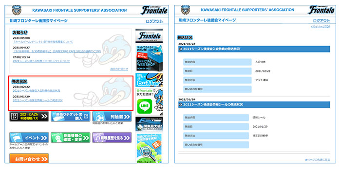 各種特典を発送したタイミングで、「後援会マイページ」の『発送状況』に発送内容と発送日、問い合わせ番号を表示致します。発送状況の追跡は「問い合わせ番号」より可能となっておりますので、未着の場合は「問い合わせ番号」をご確認のうえ、川崎フロンターレ後援会事務局までお問い合わせください。