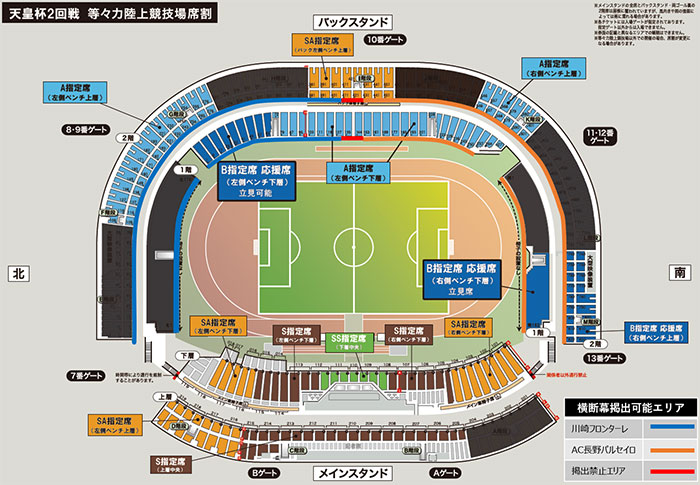 バックスタンド中央を境目(左側:川崎フロンターレ、右側:AC長野パルセイロ)に区切り運用いたします。