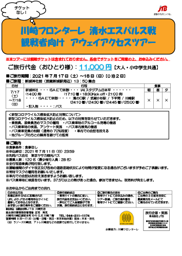 (株)JTB川崎支店では、「7月17日(土)vs清水エスパルス」の川崎フロンターレ・アウェイアクセスツアーの参加者を募集いたします。今シーズン最初のアウェイツアー!皆様のお申込みをお待ちしております!