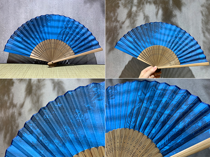 広げた時の扇形により、自然の風を感じることが出来るのが扇子の良さ。扇面部分は、友禅染めの技法のひとつでもある捺染を追求した京都の染色工場で、丁寧に染め上げ。また、扇骨も京都の扇子処が吟味した竹材を用いています。2021ユニフォーム柄にあるボーダーのデザインをベースに青色の濃淡で表現されたエンブレムを大きくデザイン。