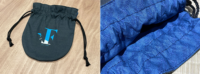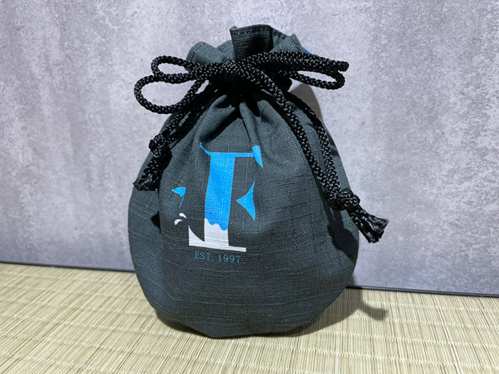 汚れが目立ちにくいブラックをベースにフロンターレのFをデザイン!京都の和雑貨工場で製作した丈夫な巾着です。バッグの中の細かい荷物をスッキリとまとめませんか!?