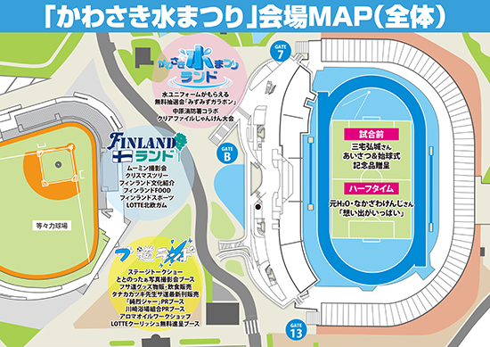 | 開催場所 | ・場外イベント広場「フサ道ランド」 ・野球場前広場「FINLANDランド」 ・メインスタンド前広場「かわさき水まつりランド」 |