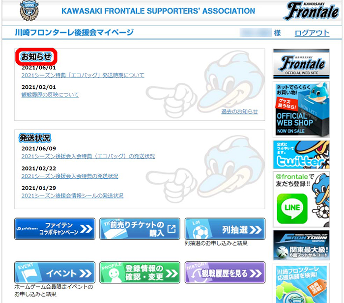 ↓後援会マイページの「お知らせ」一覧の位置(PCの場合)