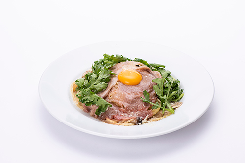 昭和36年に発売された「上を向いて歩こう」。海外では「スキヤキ・ソング」として発売され、全米1位となり、レコードの売り上げが全世界で1,000万枚以上という大ヒット曲にインスピレーションを受けた一品です。レアに焼いた国産黒毛和牛を豪快に乗せ、割下ベースのクリームソースとチーズが癖になる味。 |