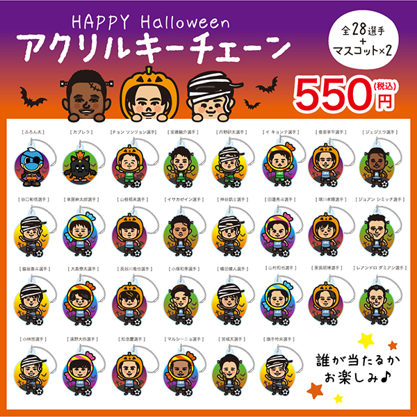 ‟仮想”の選手仮装をイラストでデザイン!全選手+サポーターの方が応募して決定したマスコットの仮装デザインの中からランダムで一つ入っています。アクリルを半透明仕様にして少し怖い...。ハロウィン特別ver.です!