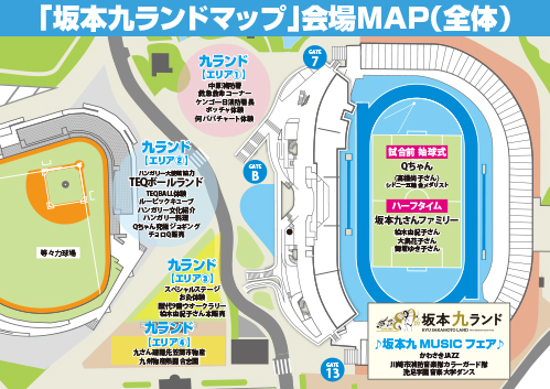 当日は坂本九さんの音楽と九さんの名前″キュウ″に関連する企画が目白押し!その数なんと36ブース!!(ホントは99やりたかった!)この日の試合はキックオフ時間が13:00と早いため、イベント時間は午前10:00から試合を挟んで午後16:30まで開催いたします。試合前も試合後も(試合中も公園利用者を対象にオープンしています)坂本九ランドを思う存分楽しんでください。