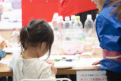 | 内容 | 紙皿やペットボトルの中にビーズなどを入れ、世界に1つだけのオリジナルの楽器を作ろう!完成した手作り楽器で会場内で繰り広げられている「坂本九MUSICフェア」演奏やダンスパレードを一緒に盛り上げよう!! ※出来上がった楽器を持って、川崎市消防音楽隊・カラーガード隊「レッド・ウイングス」と一緒にパレードにご参加いただくことができます。 ①参加者=10:35~のパレード ②③④参加者は=11:40~のパレード
