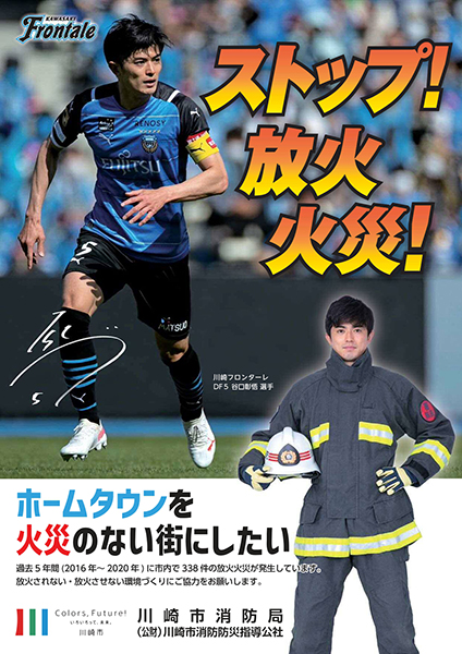消防隊の防火服姿の谷口彰悟選手に御注目いただくとともに、放火されない・放火させない街づくりに御協力をお願いします。(川崎市消防局)