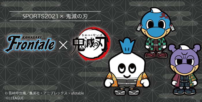 鬼滅の刃のキャラクターがフロンターレデザインのサッカーボールで遊んでいる様子をデザインしたキーホルダーと、ふろん太&カブレラ&ワルンタが鬼滅の刃キャラクターの衣装を着たここだけでしか手に入れられないグッズ!