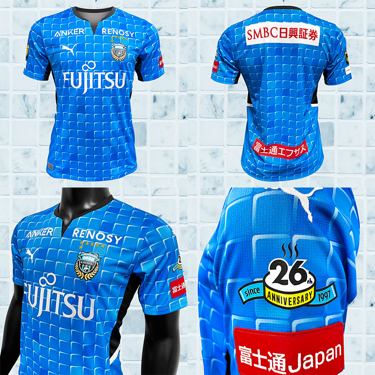 袖には2022シーズン限定の26周年特別仕様のロゴを配置し、首元はレイヤード仕様の襟を独自採用。また、サイドには差し色としてブラックとホワイトを配色することで、アニバーサリーイヤーの祝福とピッチ上での新たな選手の見え方を両立したデザインに仕上げています。