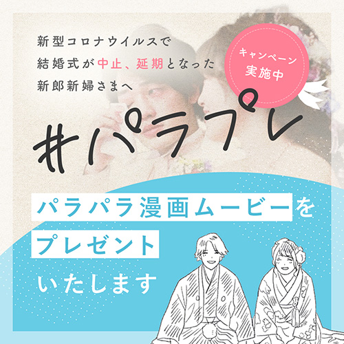 今回、タイアップで漫画を制作いただいた感動スタジオでは、新型コロナウイルスの影響で結婚式を中止・延期になった新郎新婦さまを対象に、抽選で「パラパラ漫画ムービー」をプレゼントするキャンペーンを2022年1月8日(土)より実施いたします。