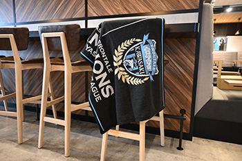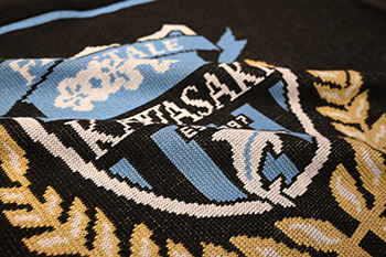 ‟優勝=金”ということで金糸を使用した特製タオルマフラー。ブラックとゴールドの色合いがカッコいい一本。
