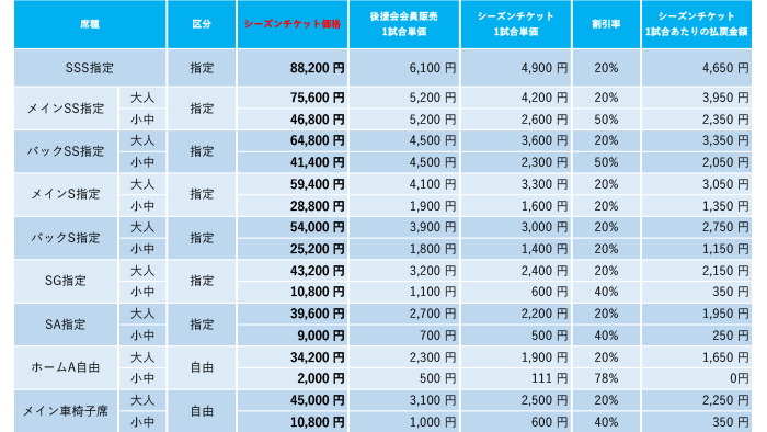 ※2021シーズンにチケット価格を改定させていただきましたので、シーズンチケットの価格も変更となっております。