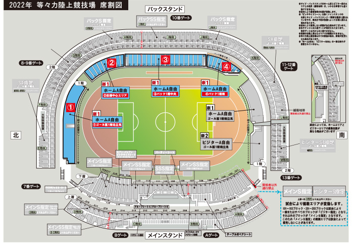 2022シーズンのホームA自由のシーズンチケットの運用については、原則「自由席」運用となります。 但し当面の間は都道府県との「感染防止安全計画」に則り、感染対策の強化が必要となるため「ホームA指定」として「全席指定席」で運用をする予定です。新型コロナウイルス感染状況を考慮しながら都道府県と調整し、「自由席」運用に移行を検討してまいります。 「自由席」運用時:ホームA自由として使用可能 「指定席」運用時:ホームA指定として使用可能 ◎指定席運用時の「ホームA指定ゴール裏1階北立見」の配席については、感染対策として、原則「左右1席空き」で運用いたします。 |