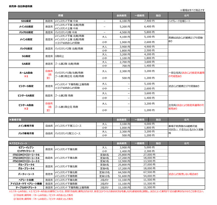 2022シーズン 前売券・当日券価格表(税込)