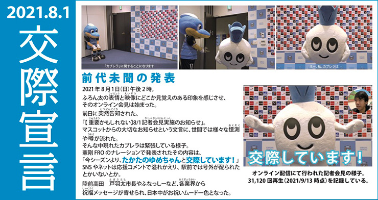 それが縁となり、「カブレラ」と「たかたのゆめちゃん」が2021年8月1日(日)にマスコット史上初の「交際宣言」をし、10月2日(土)にカブレラがプロポーズ。そして11月27日(土)、遂にゴールインパーティー実施の発表をいたしました。
