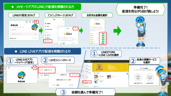 ・投げ銭を行うには、視聴されるアプリに事前にチャージが必要です。 ◇普段お使いのメッセージアプリ「LINE」で配信を視聴される方 ※還元コインやボーナスコインなどコインをご購入される場所によって異なりますので、お客様ご自身でご確認お願い致します。 |