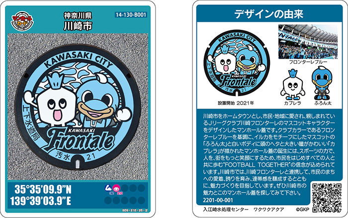 川崎市と川崎フロンターレは、連携して、市民のまちへの愛着、誇りを育み、連帯感を醸成するとともに魅力づくりを目指しており、令和3年9月に川崎フロンターレとのコラボにより設置したマンホール蓋をカードのデザインとして採用しました。カード表面にマンホール蓋画像、裏面にマンホール蓋のデザインの由来等を紹介しています。