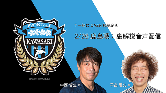 進行・解説役として、「川崎フロンターレクラブ特命大使」である中西哲生さんと、DAZNでおなじみの平畠啓史さんのお二人をお迎えします。ここだけでしか聞けない裏解説や忖度なしのガチトークをお楽しみください!