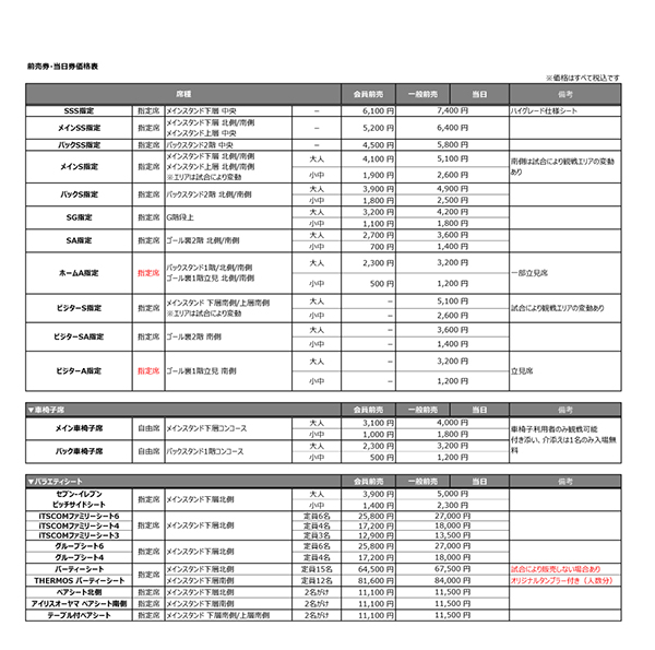 | 価格 | 会員前売価格 ※試合当日は当日券価格となります。 |