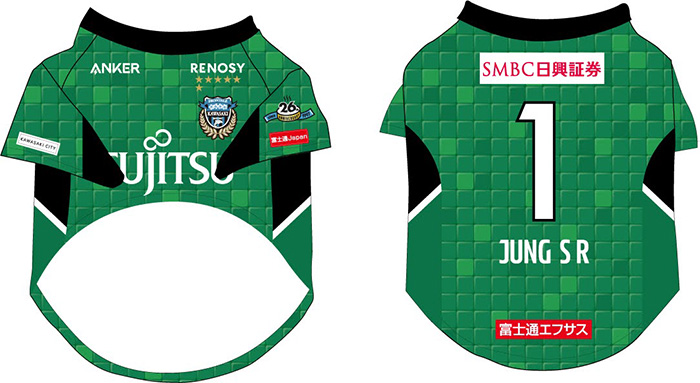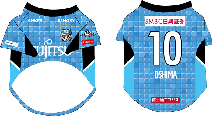 愛犬にお気に入り選手のネーム・ナンバーが入ったウェアを着せこみ、フロンターレファミリーの一員に!