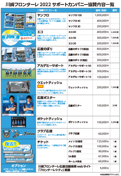 年間チケットや川崎フロンターレアカデミー・スクール生専門誌『ヤンフロ通信』への広告掲出など、多くの企業様にご協賛いただけるよう、幅広い内容の商品をラインナップしております。
