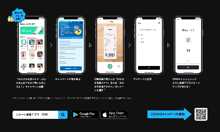 「かわさき応援バナナ」2パックまたは「かわさき応援アボカド」1パックを購入したレシートを撮影し、レシート買取アプリ「ONE」でアップロードしてご応募ください!