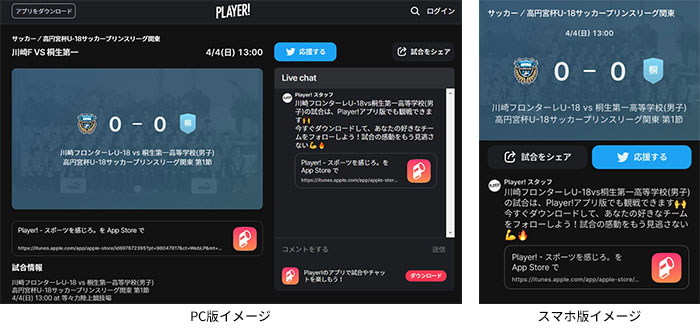 今節は試合観戦に制限が設けられるため、フロンターレアカデミーの選手たちの戦いぶりをタイムリーに皆さんにお届けするため、スポーツライブエンターテイメントアプリ「Player!」にて試合速報を実施します。コメントを書き込むこともできますので、皆さんぜひご覧ください。