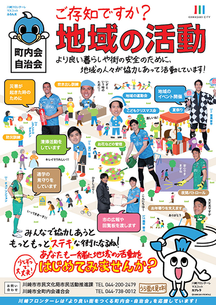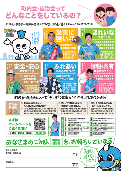 このたび、川崎市が製作する「町内会・自治会活動推進」の啓発チラシに、当クラブの選手が起用されましたので、お知らせいたします。