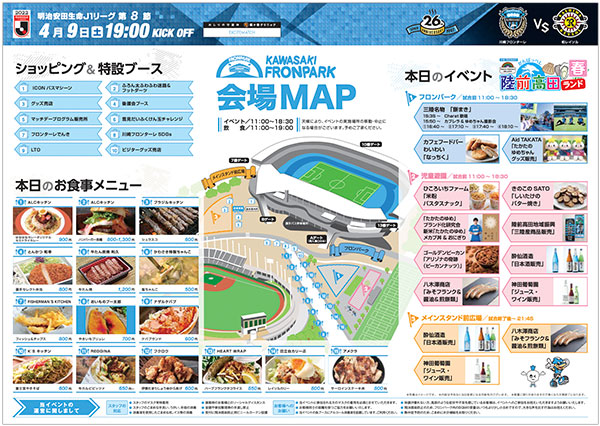 | 時間 | 11:00~18:30@場外イベント広場「フロンパーク」、児童遊園 試合終了後~21:45@メインスタンド前広場 ※試合終了後は、お買い上げいただいたビン・缶の商品のお渡しのみとなります。 |